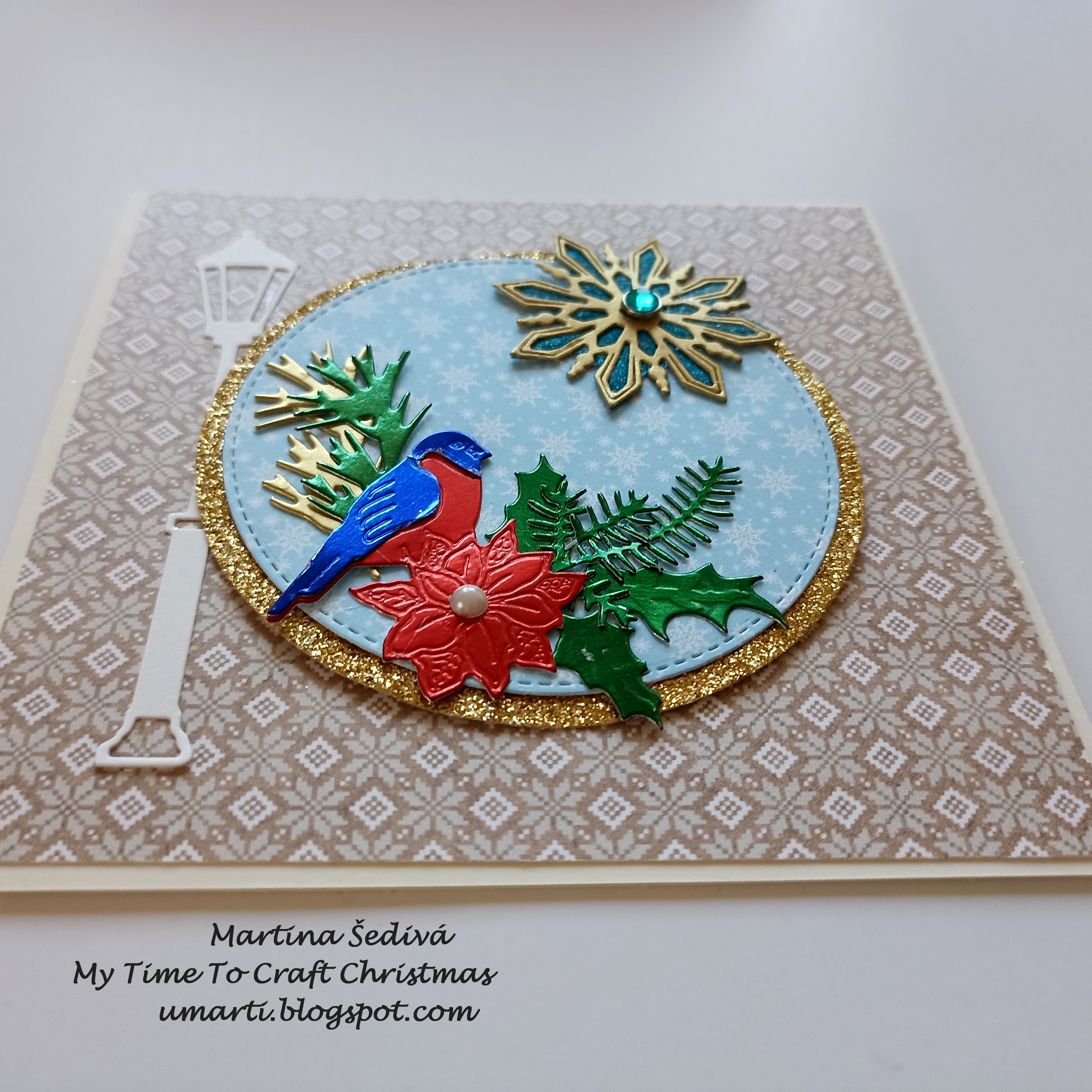 Nový úkol na MTTCC je použití fólie. Z lesklé fólie jsem vysekla ptáčka a větvičky, z třpytivého papíru zlatý kruh a vločku. Doplnila jsem jen výsekem lampy.